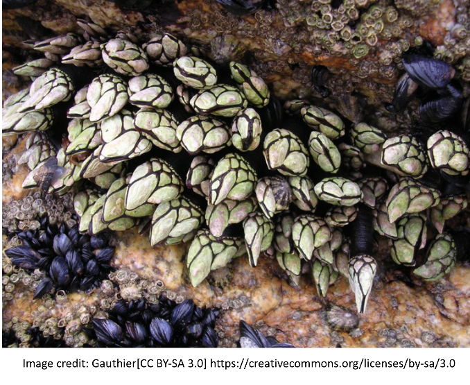 Specifically, theyβre goose-neck barnacles, each of which sits on a peduncle (a flexible, muscular stalk). Rock is their natural habitat, but theyβll happily settle on driftwood and shipwrecks if available.