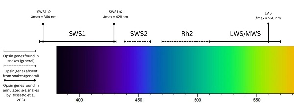 As demonstrated by the the relevant opsin genes found in annulated sea snakes (as reported by Rossetto et al. 2023) and the wavelengths at which the absorption of photons is as its strongest (λmax). In other words, the wavelength (and colour) of light that each opsin gene is most sensitive to.